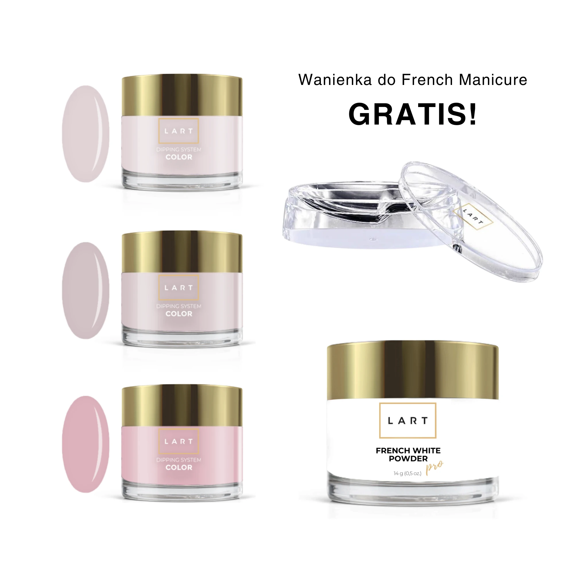 FRENCH COLLECTION - CAŁA KOLEKCJA LART PRO (3 szt pudrów kolorowych + 1 szt białego pudru do French Manicure + Wanienka do French Manicure GRATIS)